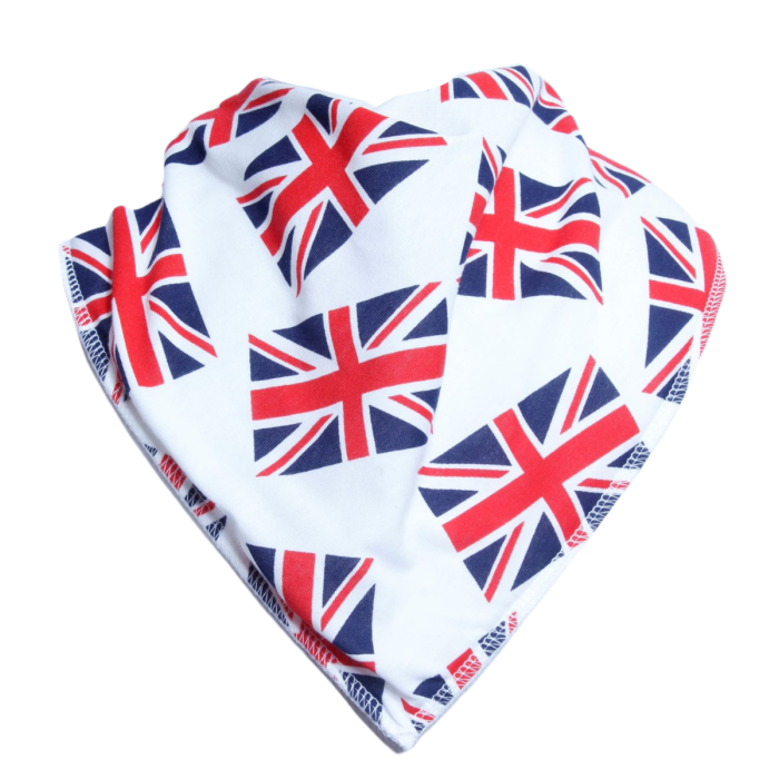 A patriotic bandana bib with mixed size Union Jacks on white with white fleece and stitching.